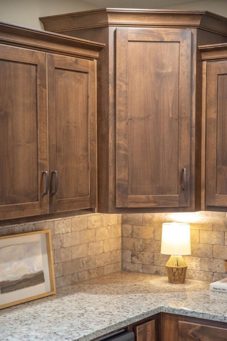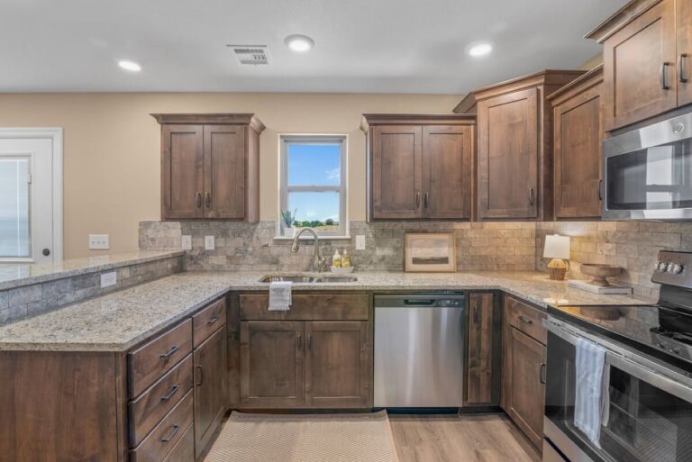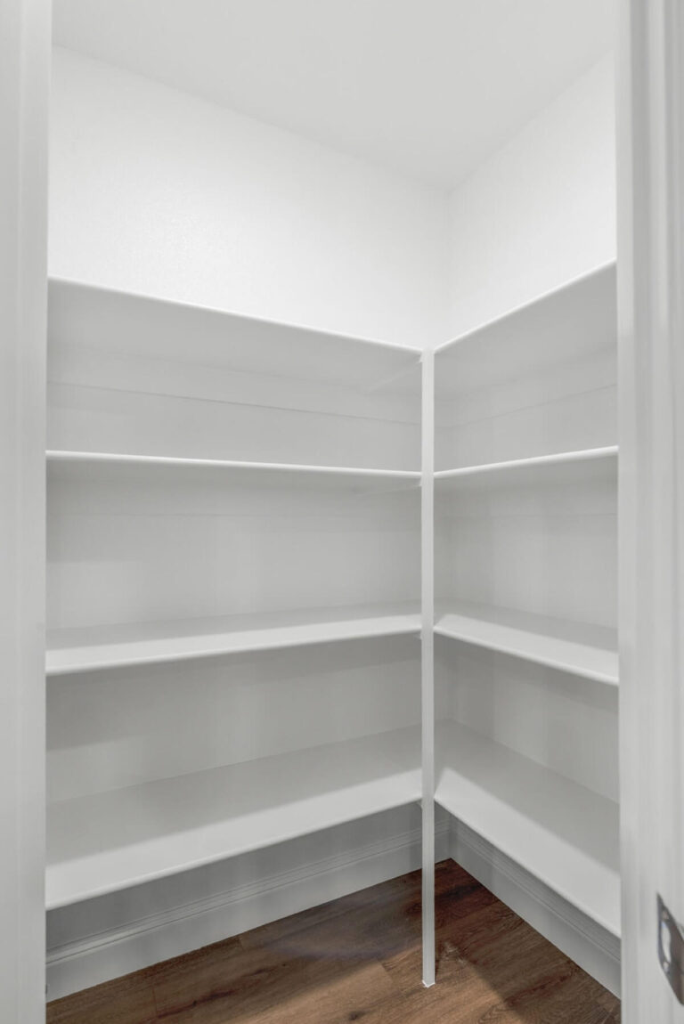 includes granite counters, customized cabinetry, stainless steel appliances, and a pantry.